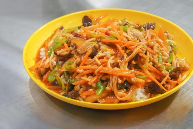 何師傅如今爐火純青的蓋澆飯手藝,很大程度上來自于張師傅對他的教導和啟發?!拔以谏w澆飯上會盡量做到營養均衡,一般炒菜時會多加點蔬菜,比如我的魚香肉絲和其他的不太一樣,是調整過的,加了香菇、胡蘿卜、青椒、紅椒、木耳,這樣搭配起來對身體營養的吸收比較有利?!?/span>